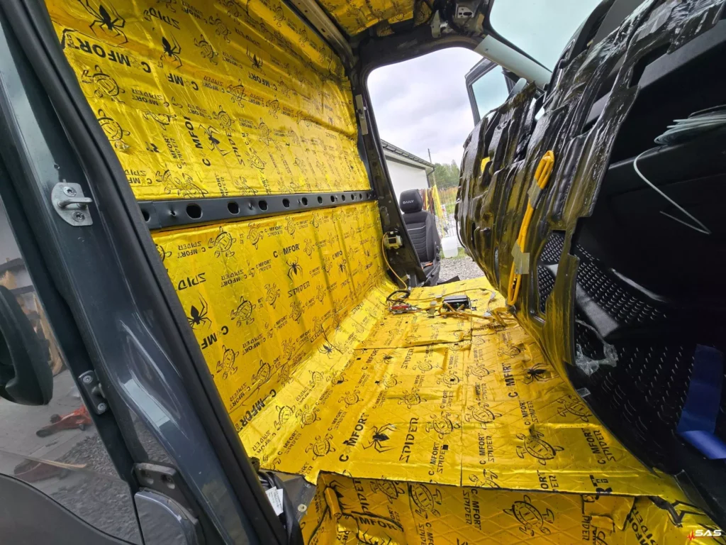 Wygłuszenie samochodu w dostawczaku Iveco Daily wykonaliśmy w standardzie premium: mata butylowa Comfort Mat Spider 3.5 mm + chłonny Comfort Mat Ultrasoft 10. Efekt to wyraźnie cichsza kabina, mniej dudnienia z nadkoli oraz spokojniejsza praca silnika pod maską. ✅ Mniej hałasu przy prędkościach autostradowych ✅ Lepsza akustyka i komfort rozmów ✅ Stabilniejszy odsłuch audio.